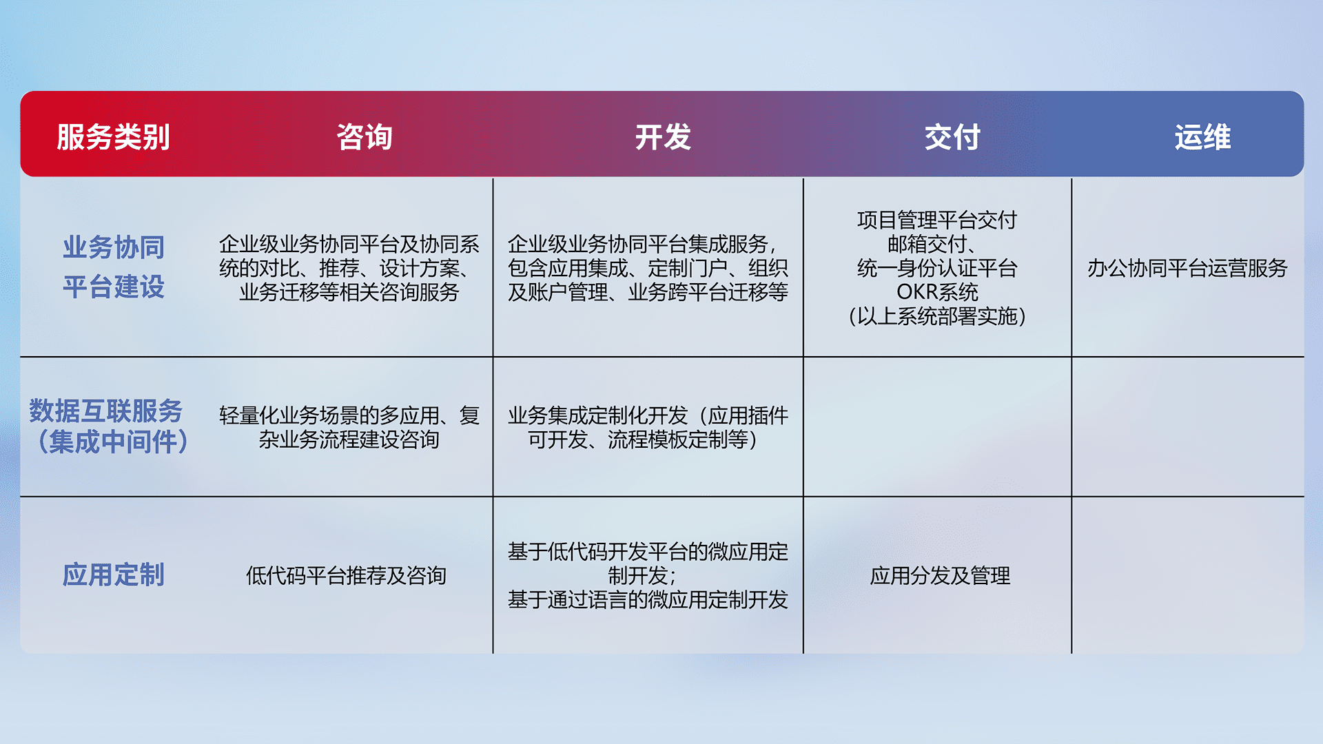 针对钉钉、、企微、、IDaas等平台级产品提供产品的规划、、、、方案、、、交付、、、定制化开发等服务,,,,实现如统一协同办公、、、智能客户服务、、混合会议管理、、、、智能数据查询、、、等业务场景,,,实现数字化转型。。。